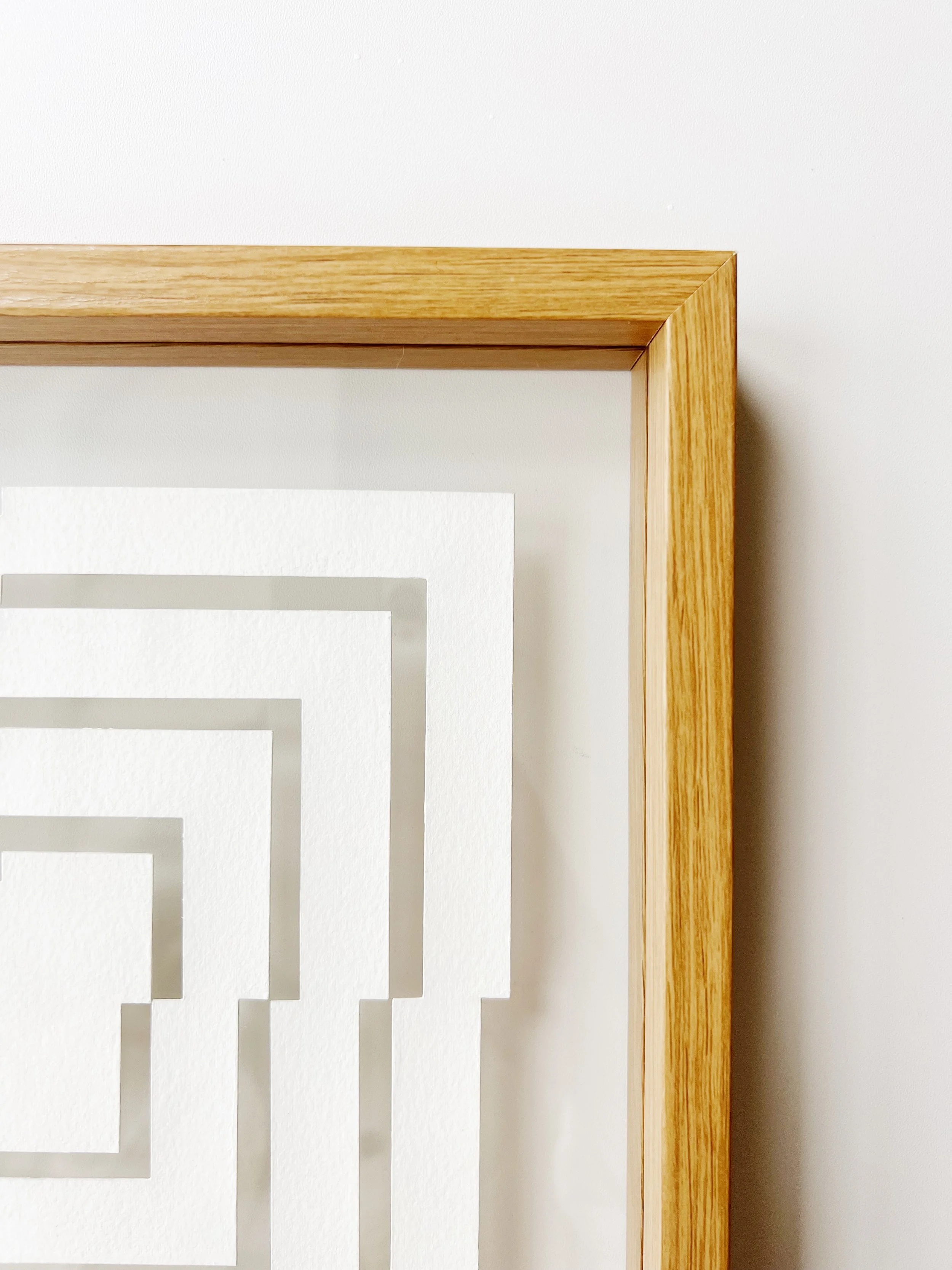 This papercut is created from thick cotton paper. The artwork is framed on a minimalistic floating frame which creates a light and airy expression because you get to see the color of your wall behind the artwork. The frame consists of two pieces of glass and four lists made of wood.